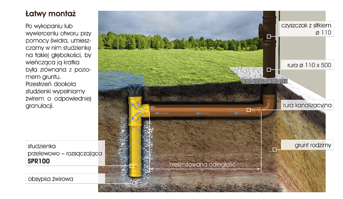 Studzienki przelewowo-rozsączające to proste i ekonomiczne rozwiązanie, odprowadzające wodę z dala od budynków, jednocześnie nawadniające obszar ogrodu. Dzięki możliwości ukrycia, stanowią estetyczny dodatek do terenu, zapewniając także stałe osuszanie i uniemożliwiając zamarzanie. Montaż jest prosty: studzienka jest umieszczana w wykopanym otworze na odpowiedniej głębokości, a przestrzeń dookoła jest wypełniana żwirem.