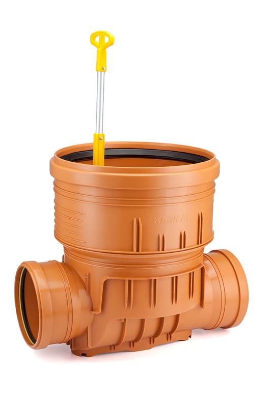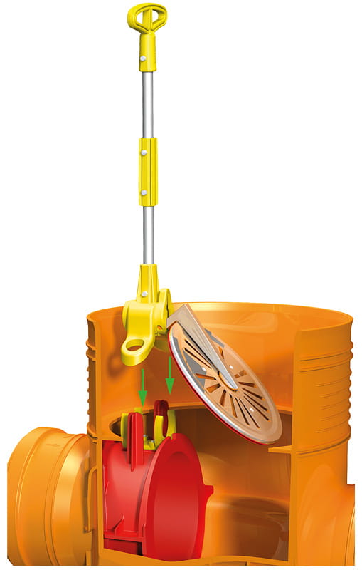 Z uwagi na przemyślane działanie zaworów zwrotnych w kinetach KARMAT studnie z zastosowaniem tych urządzeń nie wymagają obsługi podczas przepływów zwrotnych w sieci kanalizacyjnej lub deszczowej. Proces zatrzymania wody czy ścieków odbywa się samoczynnie za pośrednictwem klap zwrotnych. Klapa zwrotna na stałe jest połączona z drążkiem wykonanym ze stali chromoniklowej, drążek zakończony jest uchwytem. Dzięki temu w prosty sposób możemy wyjąć elementy studni w celu dokonania inspekcji i konserwacji sieci. Po skończonym przeglądzie zespół drążka z klapą zwrotną w prosty sposób montujemy w mechanizmie zatrzaskowych na dnie kinety. Drążek można przedłużać aż do 5 m.