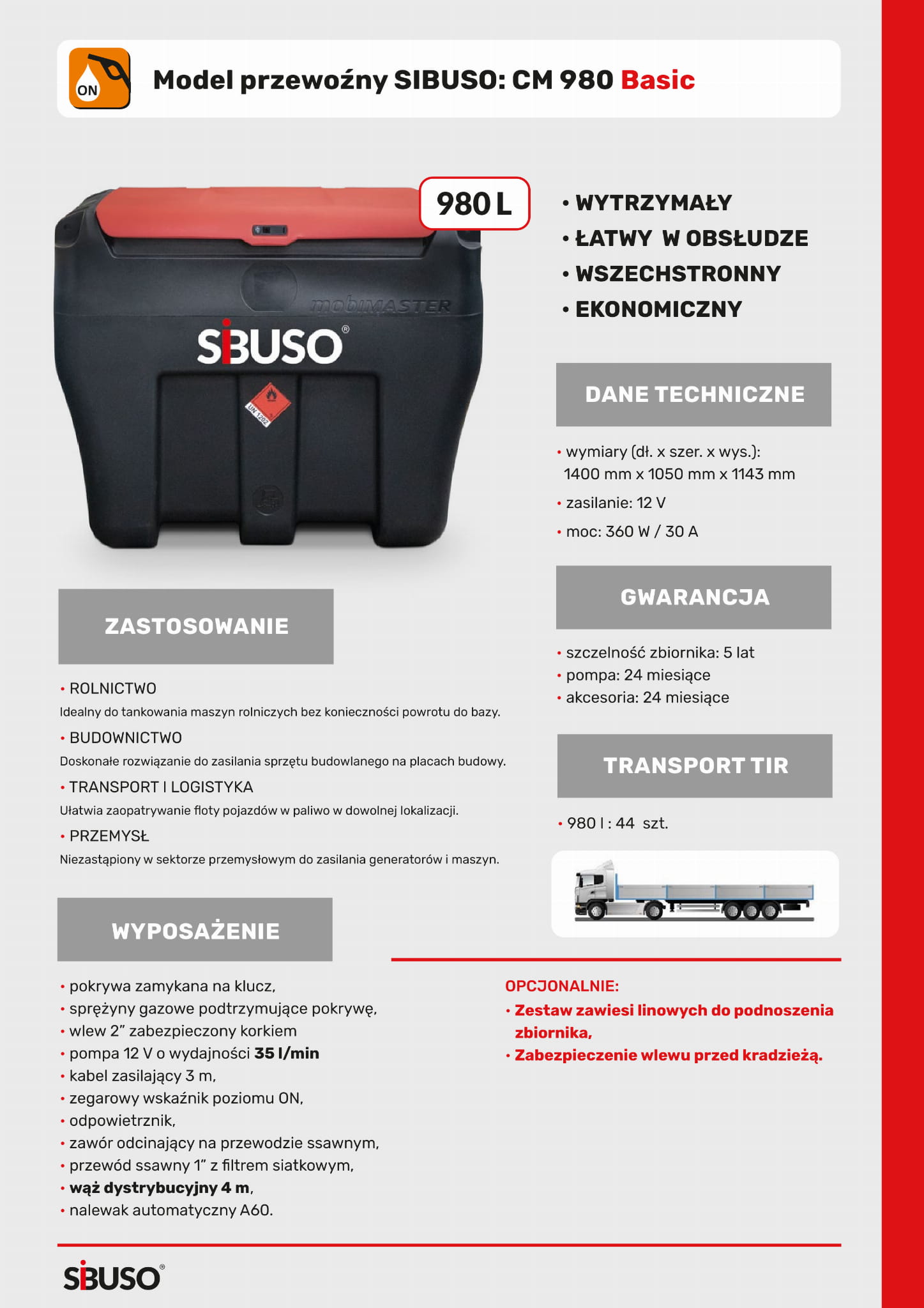 Mobilne jednopłaszczowe zbiorniki do oleju napędowego SIBUSO CM980. Idealne rozwiązanie do transportu paliwa w terenie. Konstrukcja zbiornika ( mobiMASTER ) została wykonana z czystego polietylenu, która zapewnia wieloletnie użytkowanie w trudnych warunkach, odporne na promienie UV, odporne na uszkodzenia mechaniczne jednocześnie lekkie i kompaktowe pozwalające na przewożenie w pojazdach, wózkami widłowymi oraz za pośrednictwem pasów transportowych - a to wszystko w bardzo przystępnych cenach.