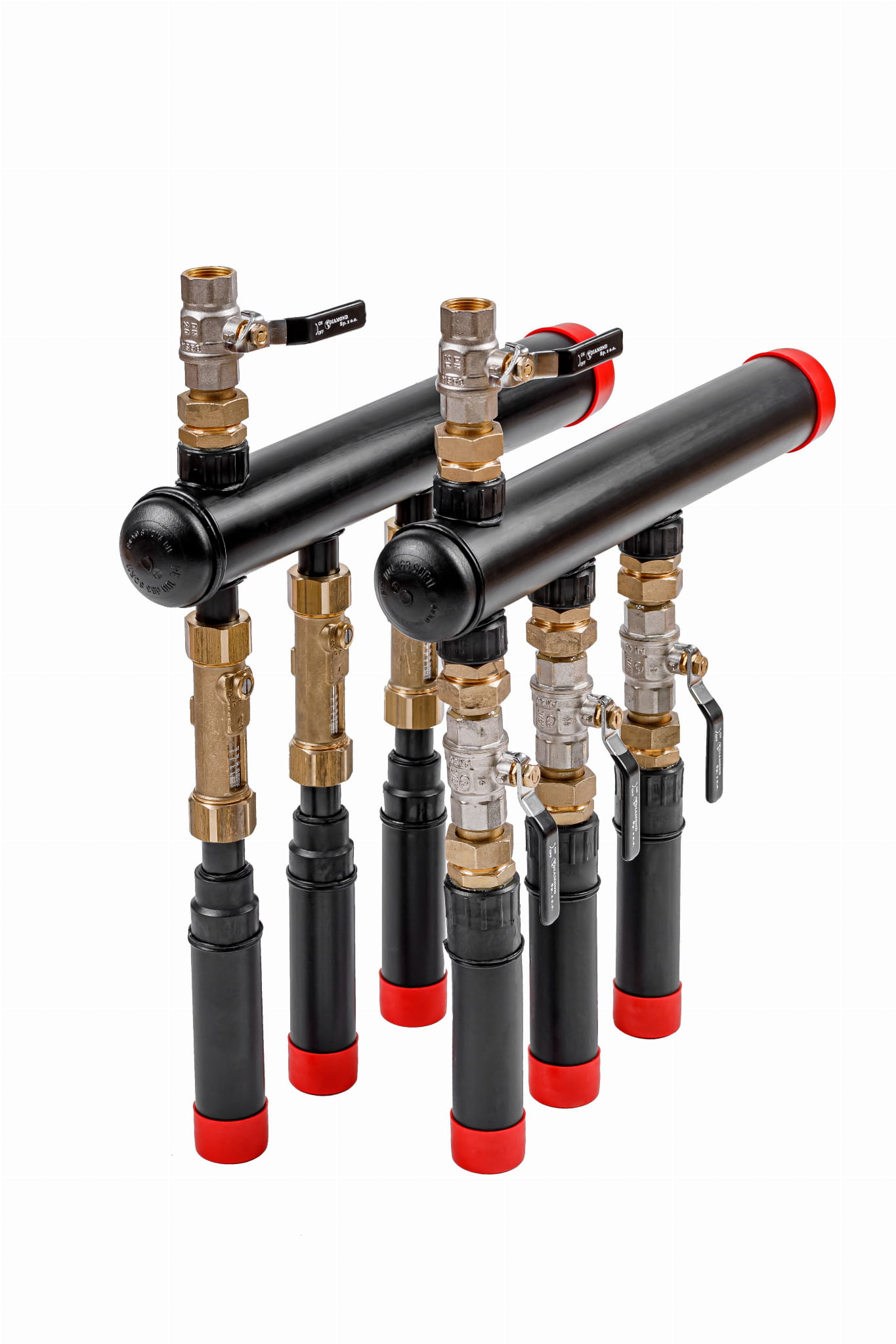 - Belka 1 kolektorowa zasilająca - na każdej sekcji wyposażona w mosiężne przepływomierze liniowe o zakresie 8-38 l/min. Rotametry umożliwiają odczyt, regulację przepływu oraz odcięcie wybranej sekcji instalacji poprzez zintegrowany z korpusem przepływomierza zawór kulowy.