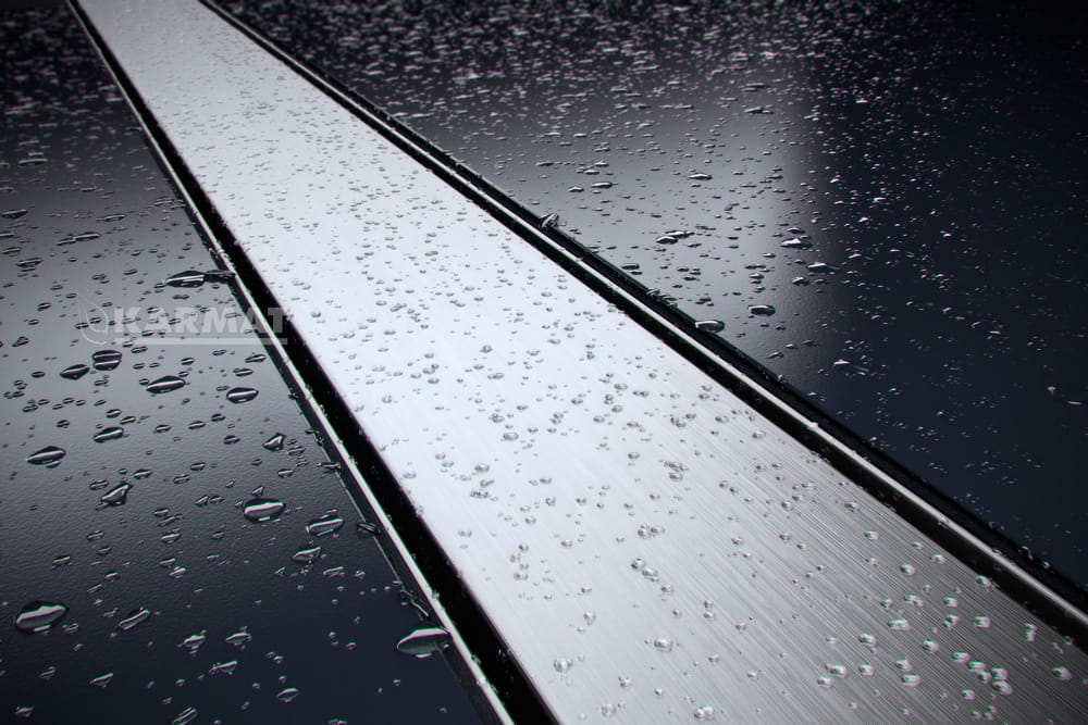Dzięki specjalnej konstrukcji rusztu KARMAT DUO istnieje możliwość montowania go w dwóch wariantach. Jedna strona rusztu ma metalową powierzchnię o satynowej strukturze a po jej obróceniu druga strona to ruszt do wklejenia płytek ceramicznych, mozaiki lub innych rozwiązań posadzkowych. W obu przypadkach woda spływa szczelinami znajdującymi się pomiędzy rusztem a rynienką odpływową.