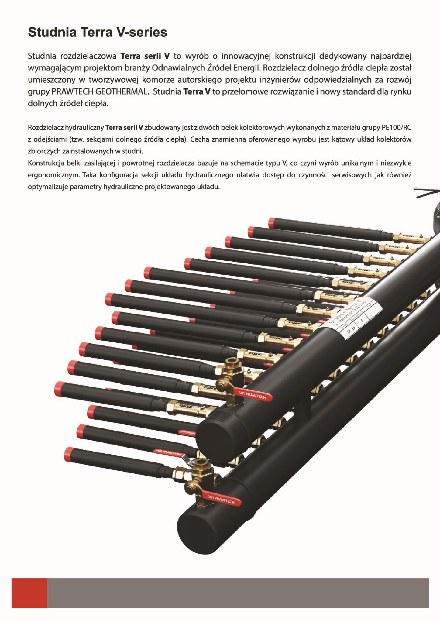 Rozdzielacz hydrauliczny Terra serii V jest zbudowany z dwóch belek kolektorowych wykonanych z tworzywa PE100 RC z odejściami zwanymi sekcjami. Główną cechą tego rozwiązania jest kątowych układ kolektorów zbiorczych studni. Konstrukcja belki zasilającej i powrotnej tworzy schemat V co czyni układ unikalnym oraz niezwykle ergonomicznym. Konfiguracja układu sekcji V ułatwia dostęp do czynności serwisowych oraz optymalizuje parametry hydrauliczne układu.
