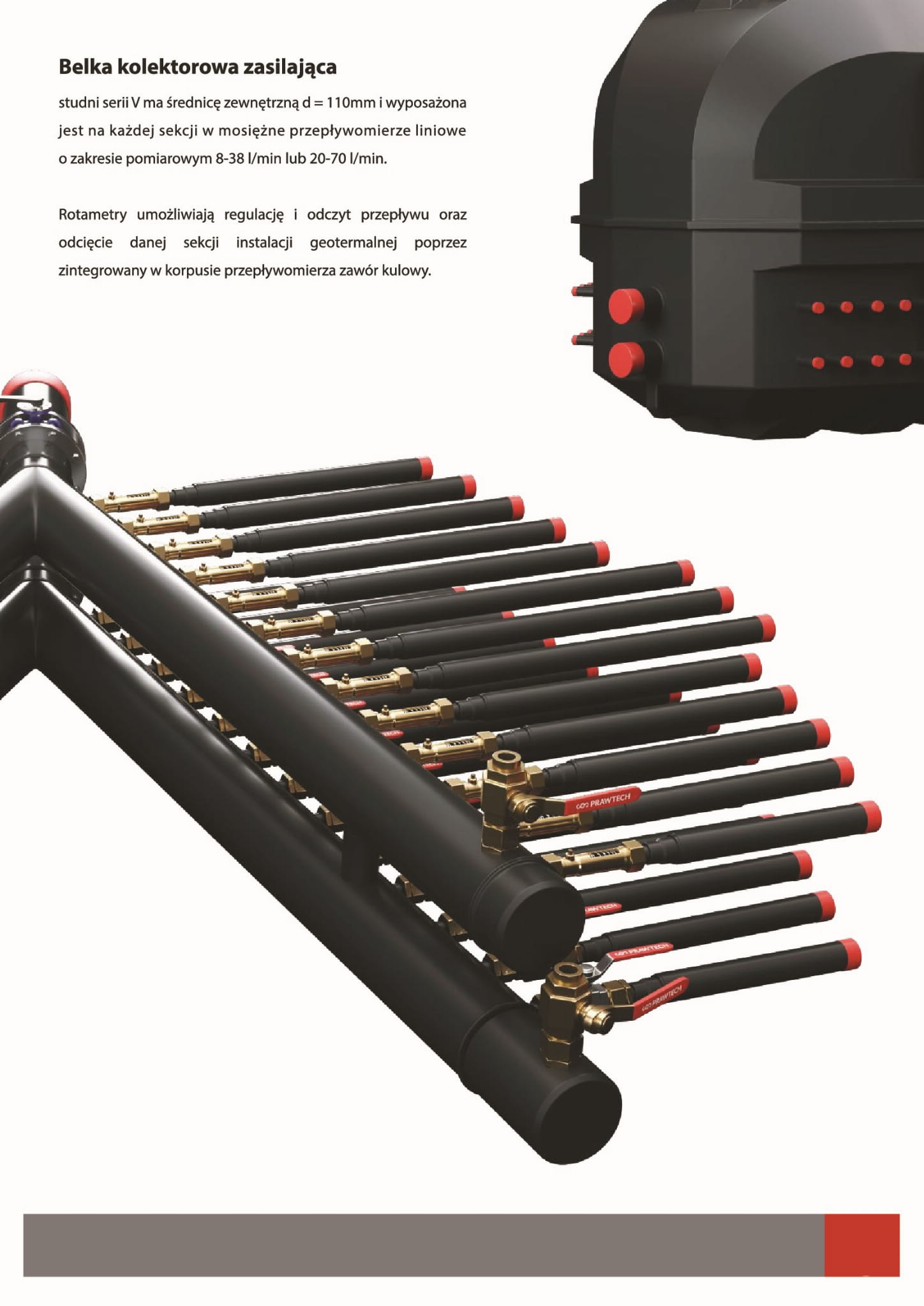 Belka kolektorowa zasilająca w studni serii V ma średnicę zewnętrzną 110 mm, każda sekcja wyposażona jest w mosiężne przepływomierze liniowe o zakresie 8-38 l/min. lub 20-70 l/min.