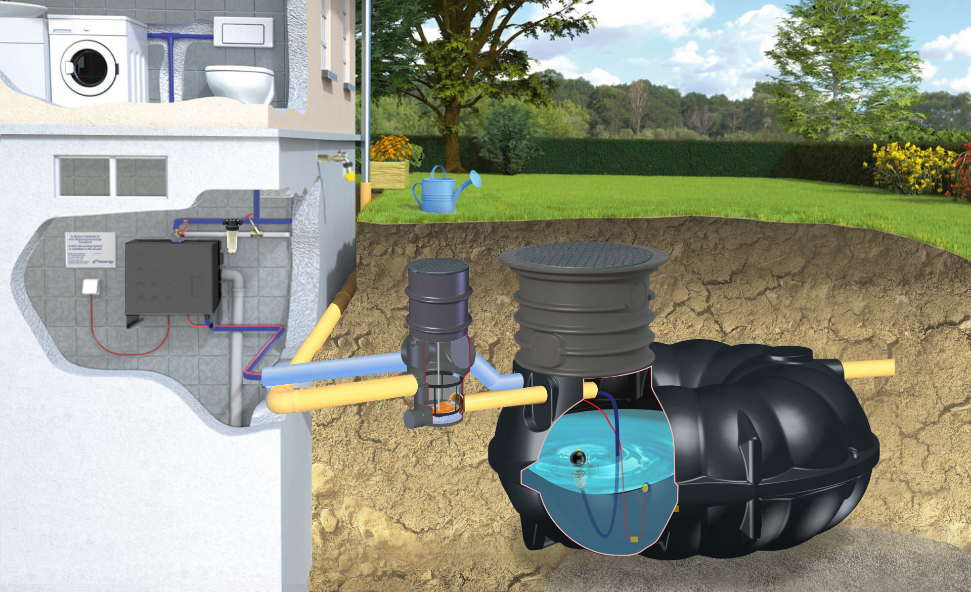 Systemy domowo-ogrodowe do deszczówki serii STANDARD ze zbiornikami MPI NEO. Zbiornik jest wyposażony w rurę trzonową VS60, filtr Maxi, nadbudowa filtra, pokrywę zbiornika TwinCover, centralę Aquamatic Domestic C PLUS, pływający pobór wody, filtr domowy do wody. System posiada trzy poziomy filtracji co umożliwia użycie odzyskanej wody deszczowej w domu.