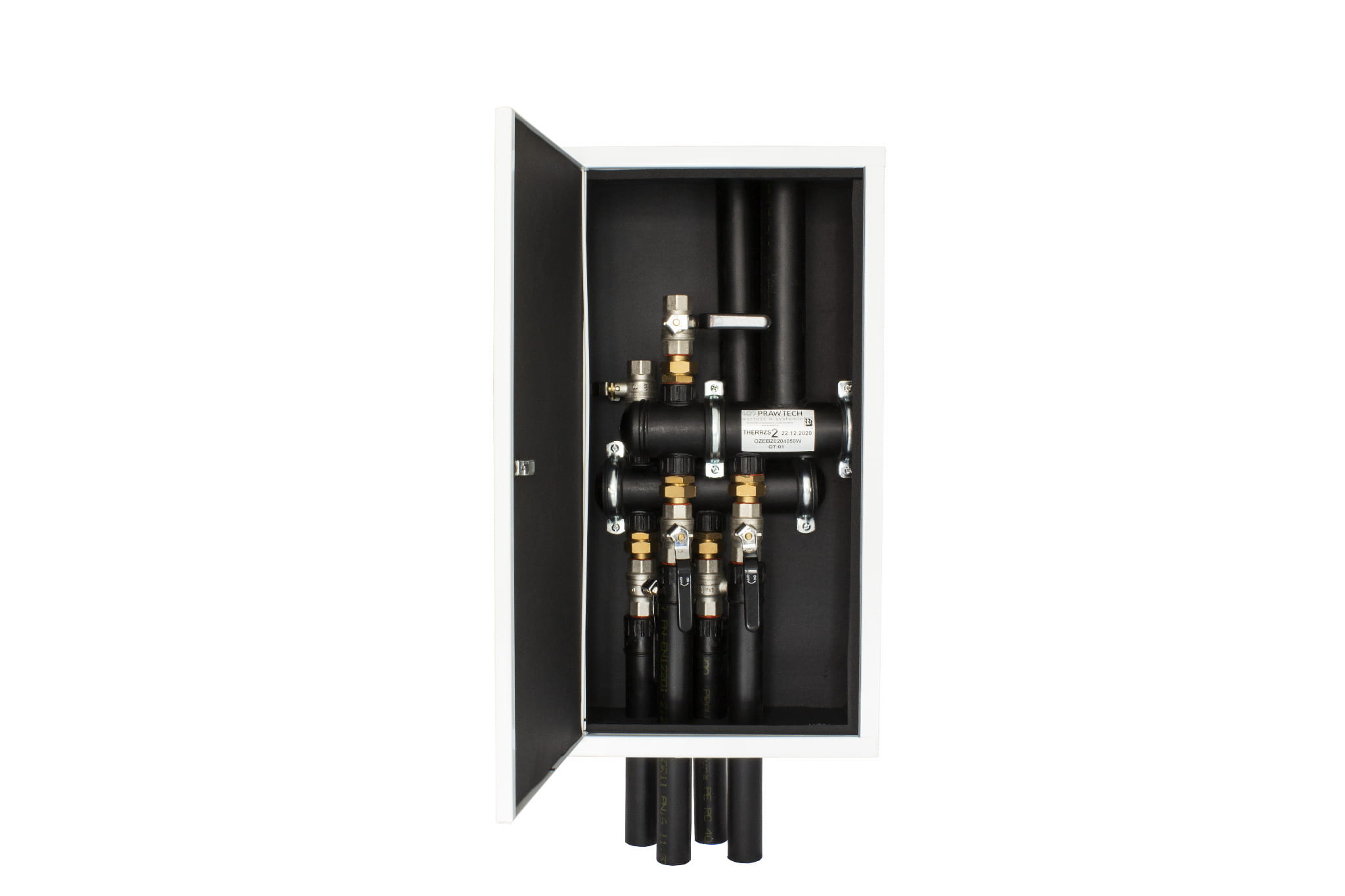 Rozdzielacze wielosekcyjne PRAWTECH w standardzie zostały wyposażone w sekcje dolnego źródła w średnicy 40 mm. Średnica rur dobiegowych do rozdzielacza wynosi 50 mm oraz 40 mm. Rury dobiegowe do szafki zewnętrznej wyprowadzone są z tylnej ścianki szafki, prostopadle do powierzchni montażowej. Wariant szafki do montażu wewnątrz budynku jest wyposażony w rury dobiegowe na górze obudowy. Odległość osiowa pomiędzy sekcjami dolnego źródła ciepła to 8 cm. Szafki występują w konfiguracjach 2, 3 oraz 4 sekcji.