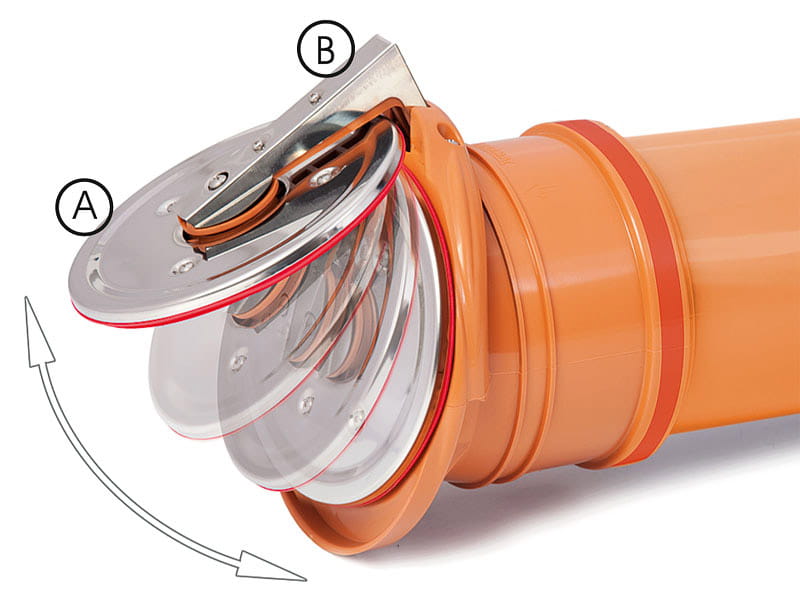 Zasuwy burzowe końcowe KARMAT są wyposażone w chromoniklowe osłony klapy zamykającej A oraz chromoniklową osłonę dźwigni B. Zapewniają ochronę przed warunkami atmosferycznymi, środowiskowymi takimi jak nurt rzeki lub wartki strumień wody w rowie melioracyjnym oraz przed przedostaniem się gryzoni do wnętrza rury.