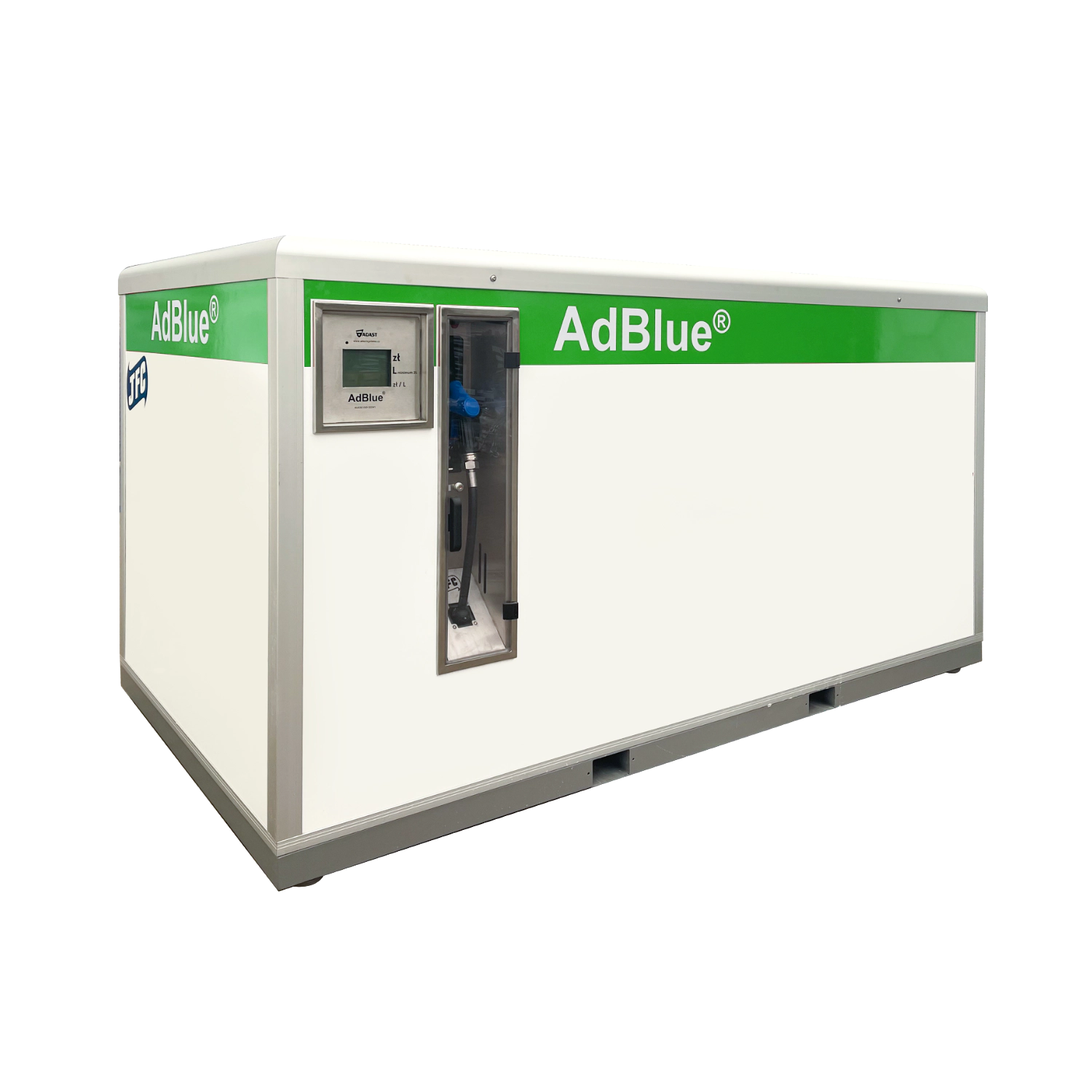 Kontenery JFCBlue® EKOLINE z panelem legalizowanym ADAST z systemem dystrybucyjnym są idealnym rozwiązaniem do magazynowania i dystrybucji AdBlue®. Kontenery gwarantują czystość i jakość przechowywanego AdBlue®. JFCBlue® posiadają możliwość połączenia z zewnętrznym dystrybutorem legalizowanym. Kompaktowe wymiary umożliwiają łatwy montaż kontenera na terenie stacji paliw o standardowej wysokości 1,2 m, dzięki temu ruch w strefie tankowania nie jest utrudniony. Budowa kontenera nie wymaga dodatkowych prac ziemnych.