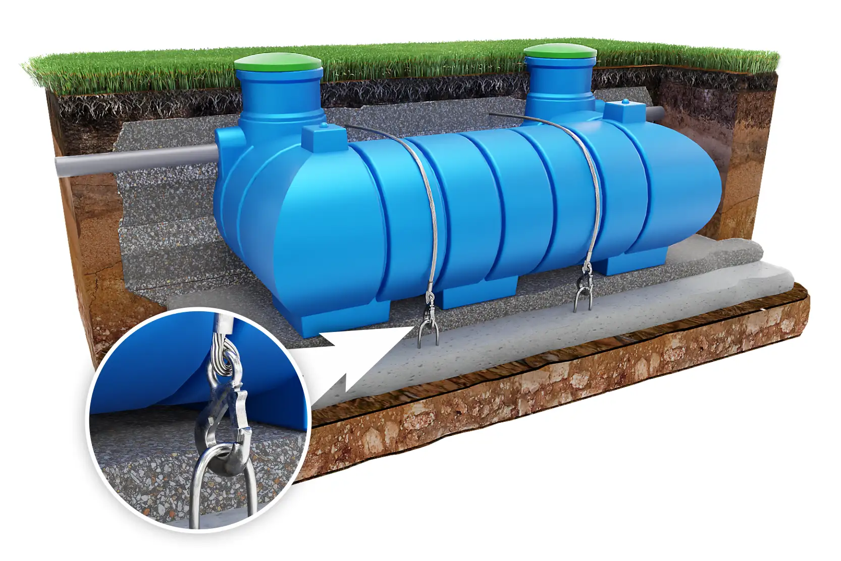 W przypadku montażu zbiornika na trudnym, niestabilnym terenie lub przy wysokim poziomie wód gruntowych, konieczne jest odpowiednie przygotowanie podłoża. Teren należy ustabilizować, aby zapewnić odporność zbiornika na nacisk wody i gruntu. W razie pojawienia się wody w wykopie, należy ją wypompować, aby prace mogły być prowadzone na suchym podłożu. Następnie pod zbiornikiem powinna zostać wykonana płyta lub wylewka betonowa, do której zbiornik zostanie zakotwiony. Kolejne kroki montażu powinny być zgodne z instrukcją montażu.