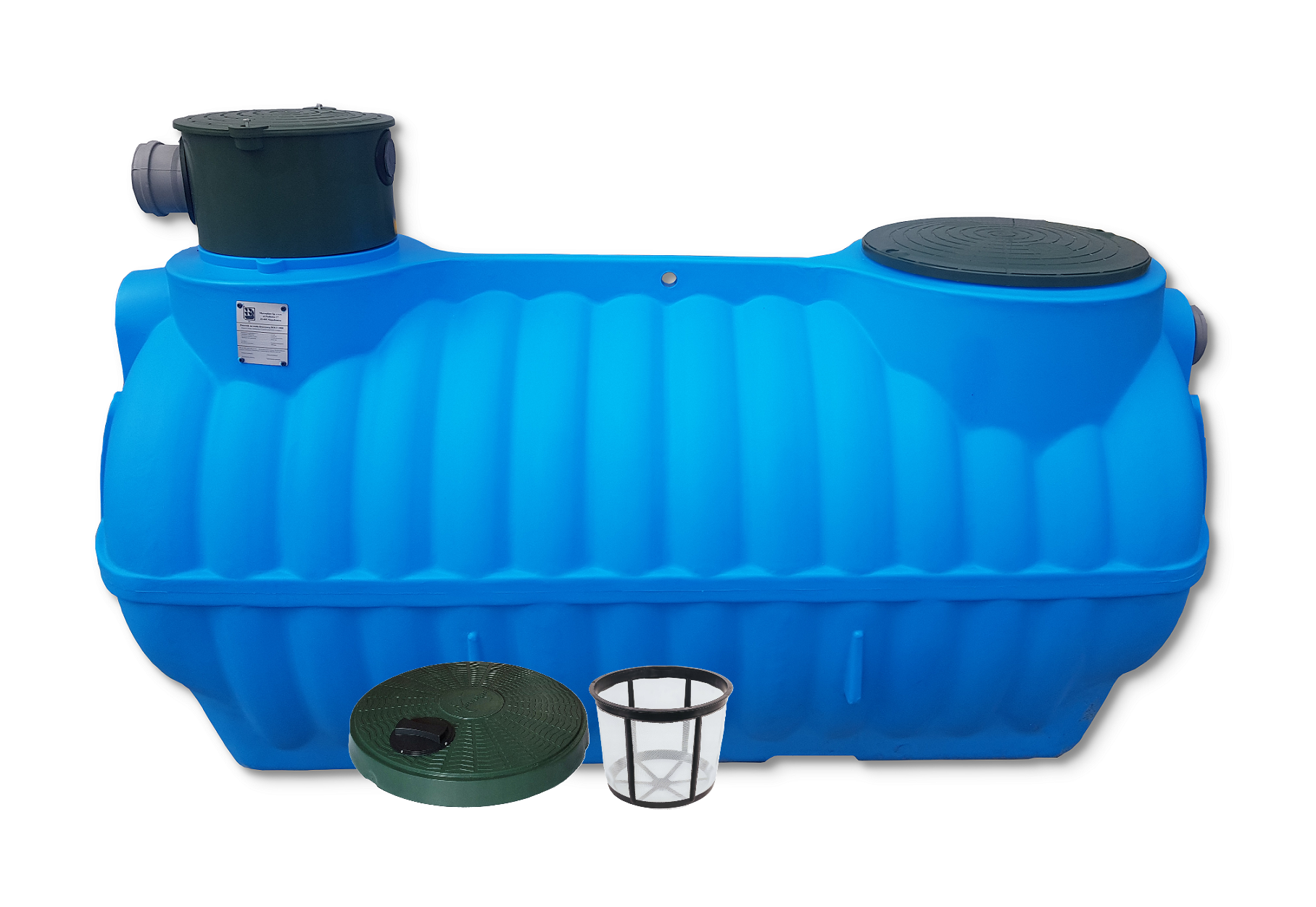 Zbiornik na deszczówkę BOLT jest sprzedawany w komplecie z pokrywami oraz sitkiem filtracyjnym.
