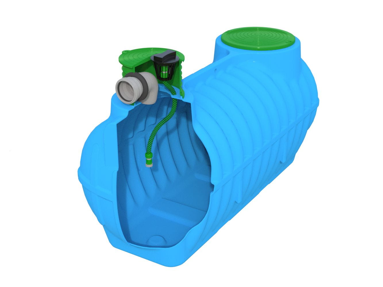 - Wytrzymała konstrukcja – zbiornik wykonany jest z wysokiej jakości polietylenu, co gwarantuje odporność na uszkodzenia mechaniczne, nacisk gruntu i zmienne warunki atmosferyczne. Technologia rotomoulding zapewnia jednolitą strukturę, co eliminuje ryzyko pęknięć i nieszczelności.