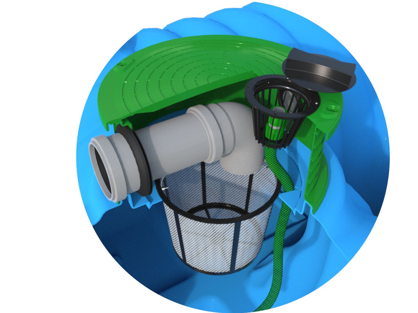 - Wbudowany filtr koszowy eliminuje zanieczyszczenia takie jak liście, piasek czy drobne odpady, co pozwala na bezpieczne i higieniczne wykorzystanie zgromadzonej wody.