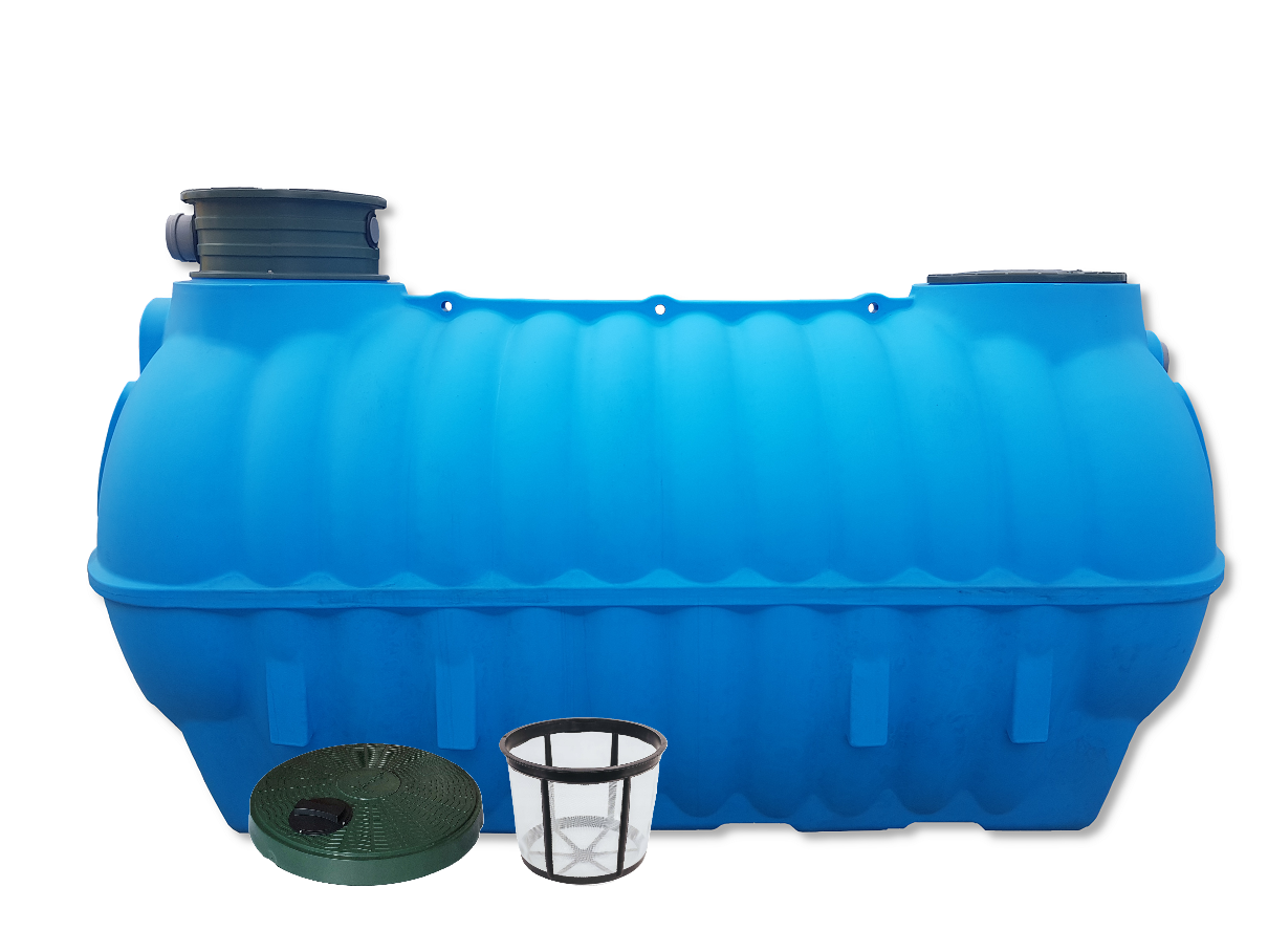 Zbiornik na deszczówkę BOLT jest sprzedawany w komplecie z pokrywami oraz sitkiem filtracyjnym.