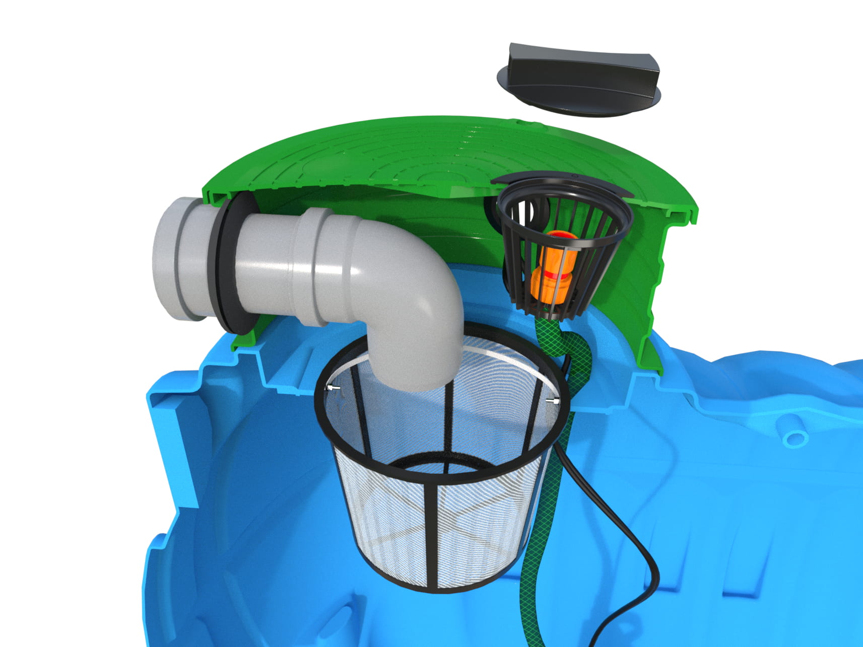 Zbiornik na deszczówkę BOLT jest sprzedawany w komplecie z pokrywami oraz sitkiem filtracyjnym.